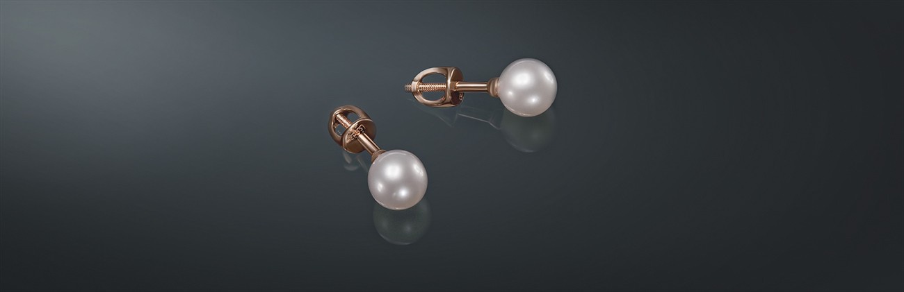 Серьги-пусеты с белым пресноводным жемчугом, на винтовом замке из золота 585˚.